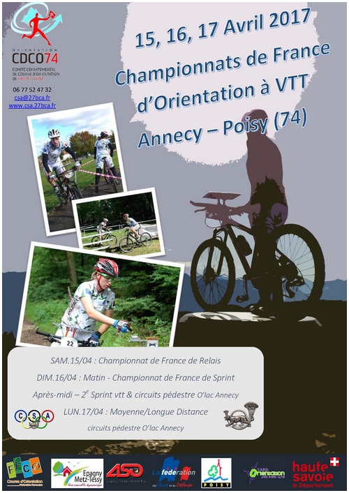 Le Comité départemental de course d’orientation de Haute-Savoie, ses clubs et l’ensemble de ses partenaires vous invitent aux diverses courses d’orientation à VTT qui seront proposées durant le week-end de Pâques, les 15, 16 et 17 avril 2017 sur Annecy à l’occasion des championnats de France de relais et de sprint de course d’orientation à VTT.